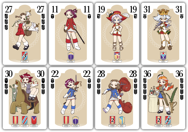 今回の例では、家札の中に含まれる要素は(FOOD, PLANT, ANIMAL, POLE, SWORD, PAGE, KINGの)7種類です。